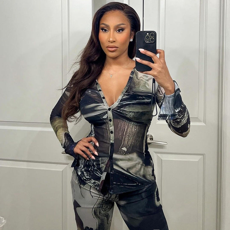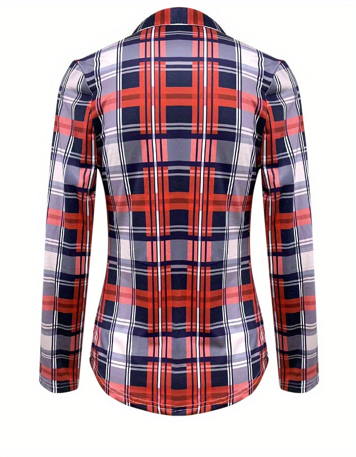 Women's Plaid Print Long Sleeve V Neck Blouse Comfortable Polyester Blend Drawstring Detailing Regular Fit Casual Top