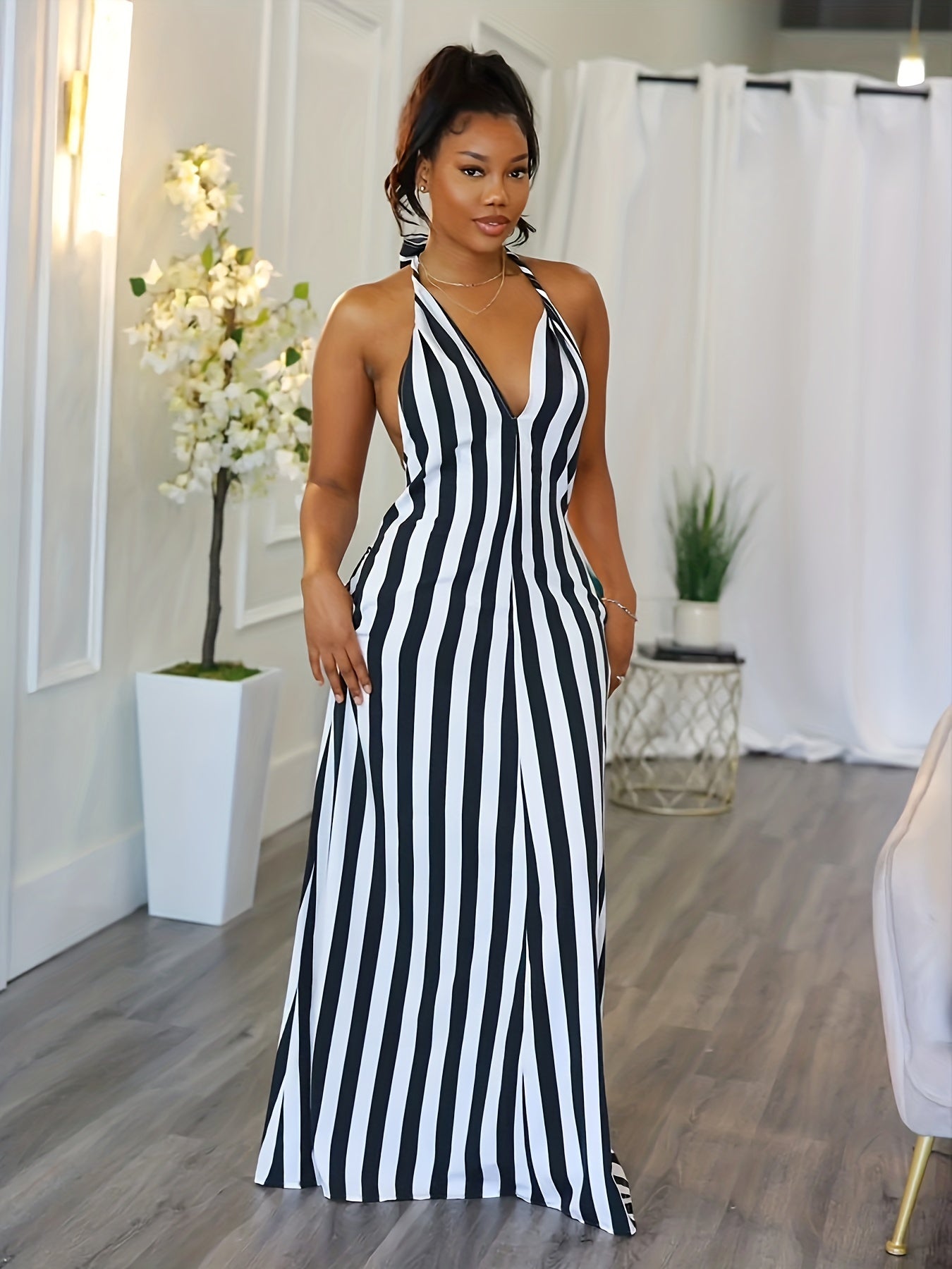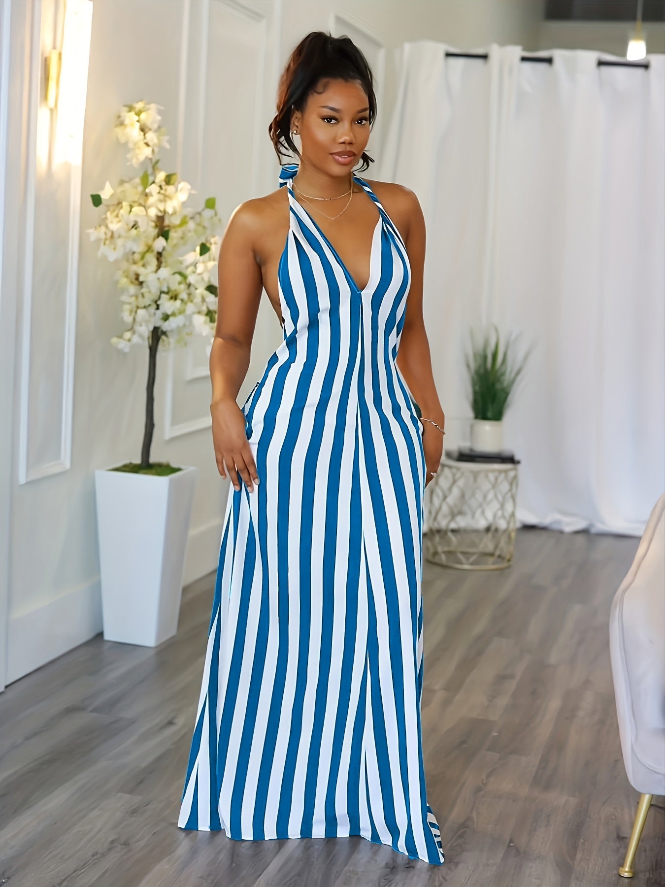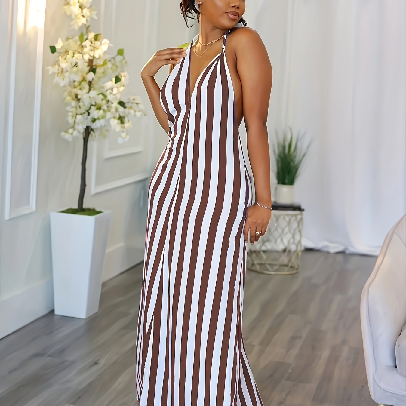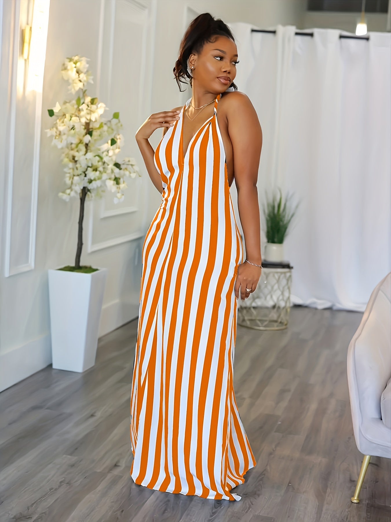 Women's Striped V-neck Halter Dress Backless Design for Spring & Summer Sexy Slip Dress 100% Polyester