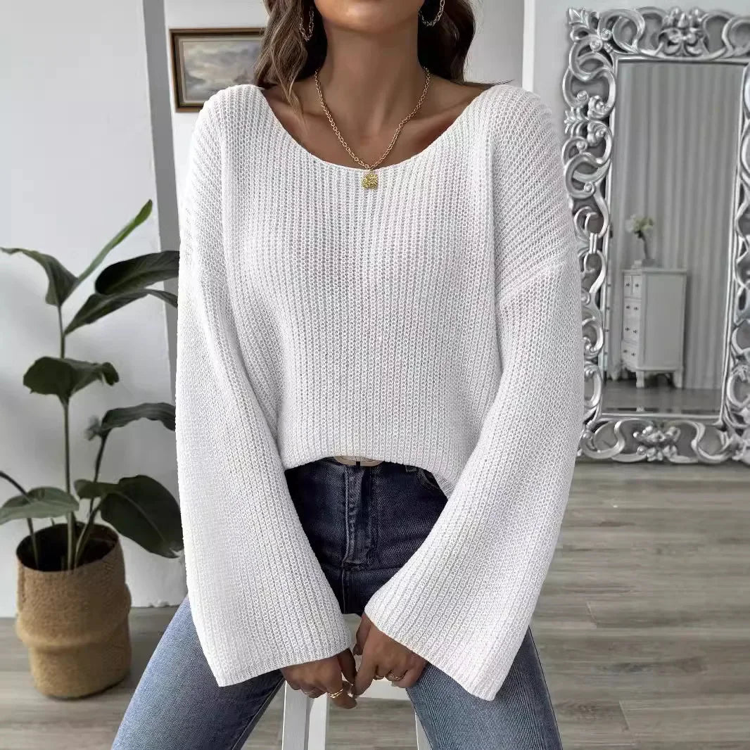 Women's Off-The-Shoulder Flare Sleeve Sweater Loose Fit Pullover Top European American Style Solid Knit