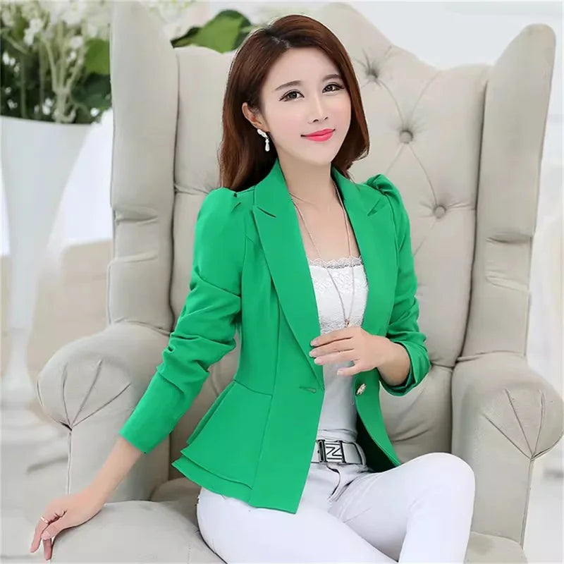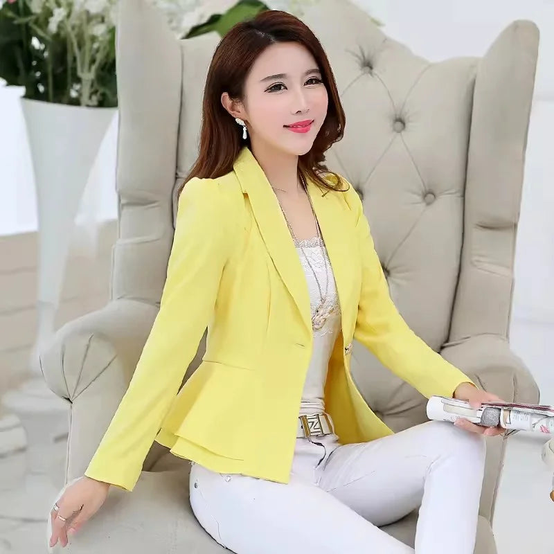 Non-Stretch Fabric: Enjoy durability with the non-stretch fabric, ensuring a consistent fit over time.,Ruffled Edge Detail: Add a touch of femininity with the ruffled edge detail, perfect for office chic., Korean Slim Fit Design: Embrace elegance with the Korean slim fit design, tailored for a flattering silhouette., Solid  Colored Suit Jacket: Choose sophistication with the solid colored suit jacket, versatile for any outfit., Spring Office Wear: Ideal for spring office wear, this blazer offers both style and comfort.