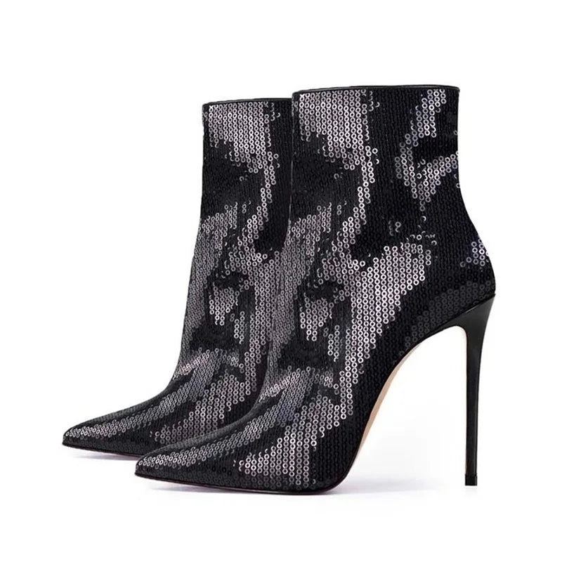 Women's Sexy Paillette Ankle Boots Pointed Toe Stiletto High Heels Slip-On Black Sequin Fashion Dress Shoes